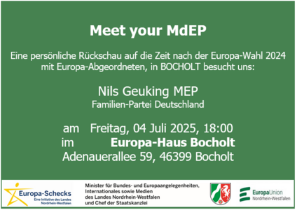 Die Europa-Wahl vor einem Jahr hat neue Menschen mit neuen Ideen in das Europäische Parlament entsandt. Was wurde davon bereits umgesetzt oder ist schon in Beratung? Welche großen Ziele mussten wegen aktueller politischer Gesamtlage zurückstehen? Welche neuen Aufgaben sind wichtig? Die EU-NRW hat dazu ein Projekt ins Leben gerufen "Meet your MdEP". In fünf (vielleicht sechs) Stationen in NRW werden neue Parlamentarier darüber berichten und sich den Fragen des interessierten Publikums stellen.   » weiterlesen