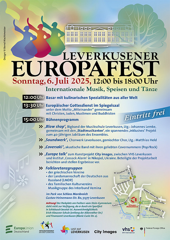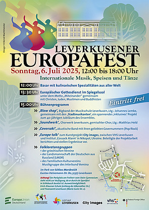 Das Leverkusener Europafest wird seit über 35 Jahren von der Europa-Union Leverkusen und dem Integrationsrat der Stadt unter Beteiligung der Migrationsvereine durchgeführt. Es ist ein besonderer Termin in Leverkusen, kurz vor den Sommerferien, der jedes Jahr mehrere hundert BürgerInnen anlockt. Im wunderschönen Park von Schloss Morsbroich begegnen sich auch in diesem Jahr die unterschiedlichen Nationen, ob als Folkloretanzgruppen und Musikgruppen auf der Bühne oder als GastrokünstlerInnen, KöchInnen und GenießerInnen an den Vereinsständen. Die internationalen Vereine informieren über ihr Angebot und verwöhnen die Gäste im Schlosspark mit kulinarischen Spezialitäten aus ihrer Heimat.
